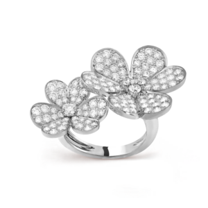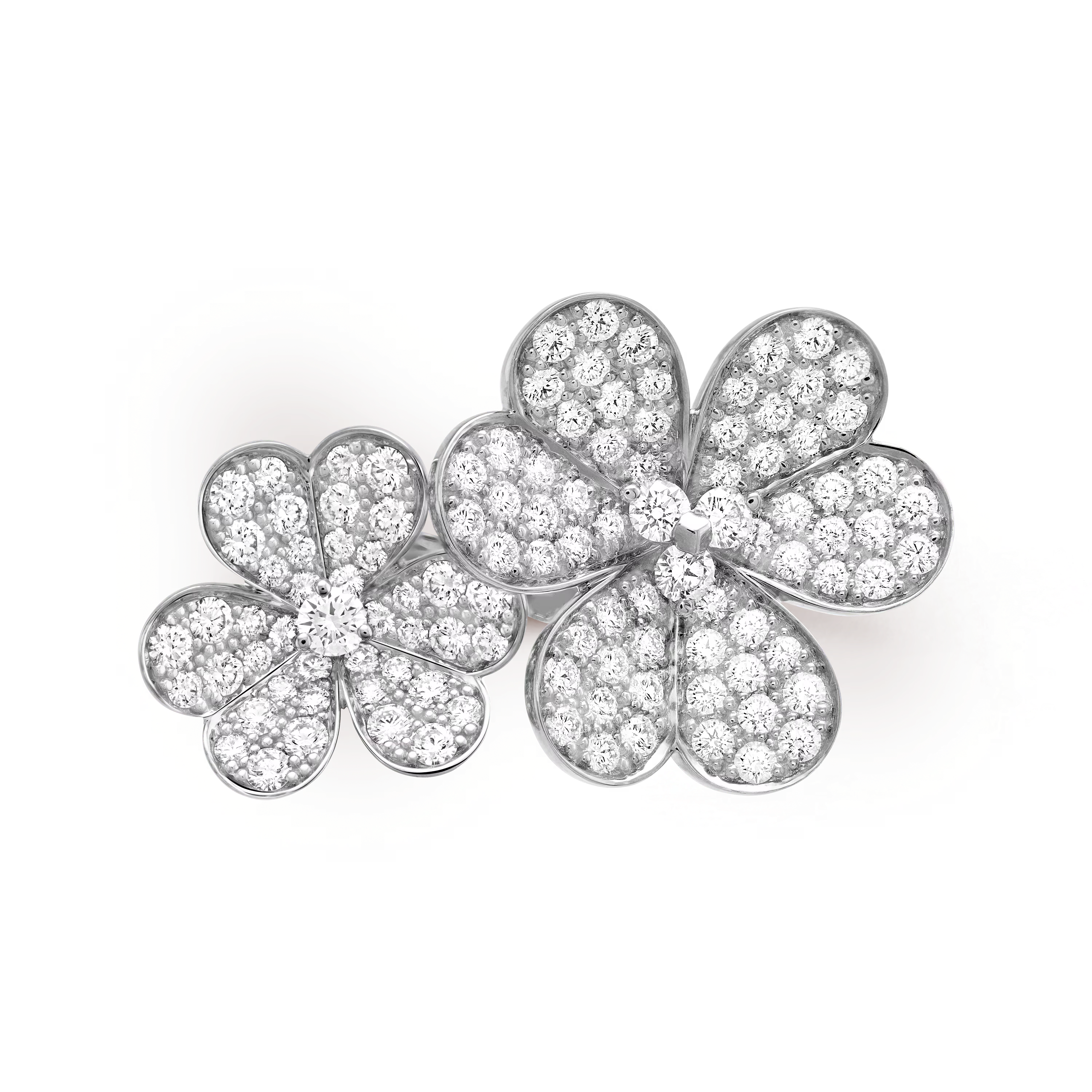 Crafted in 18K white gold, the ring features a beautifully sculpted Frivole flower motif, delicately set with brilliant diamonds at the heart of each petal. The contrast between the soft, polished gold and the sparkling diamonds creates a harmonious balance of light and texture. The between-the-finger design makes this ring a bold statement, yet its refined proportions ensure it remains elegant and wearable.