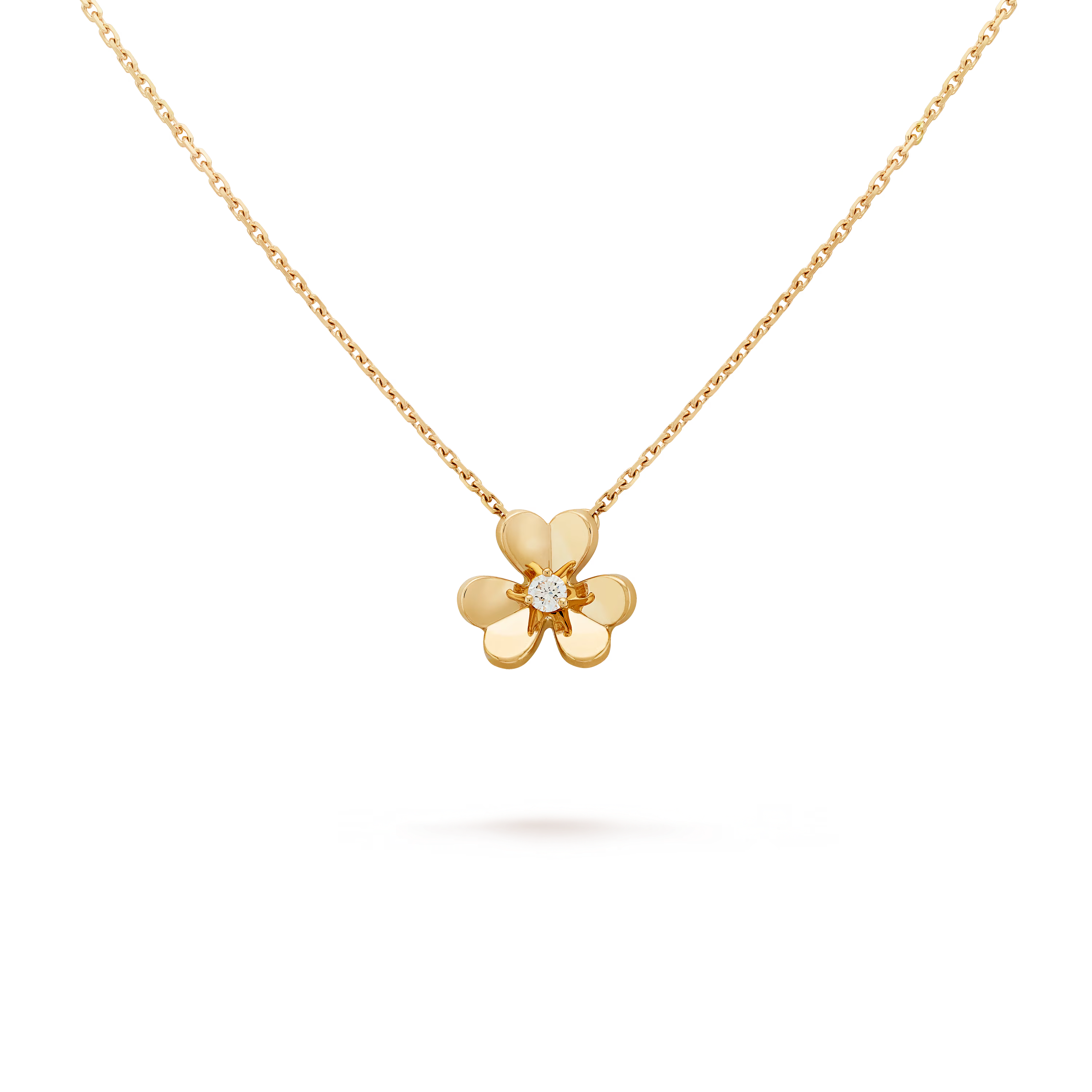 At the heart of the motif lies a single sparkling diamond, carefully selected for its clarity and radiance. Its brilliant-cut facets illuminate the polished gold petals, enhancing the pendant’s refined elegance.