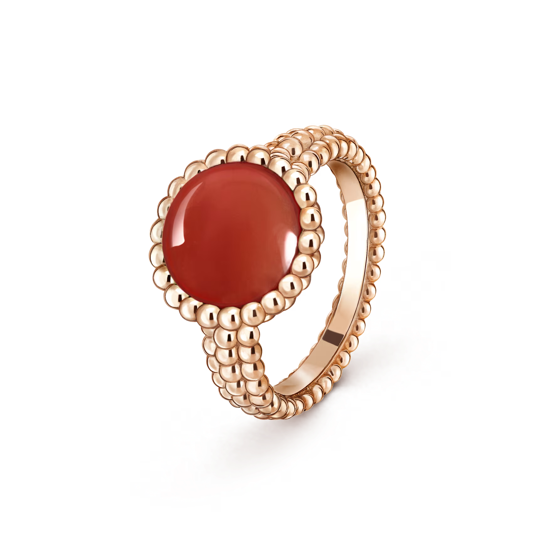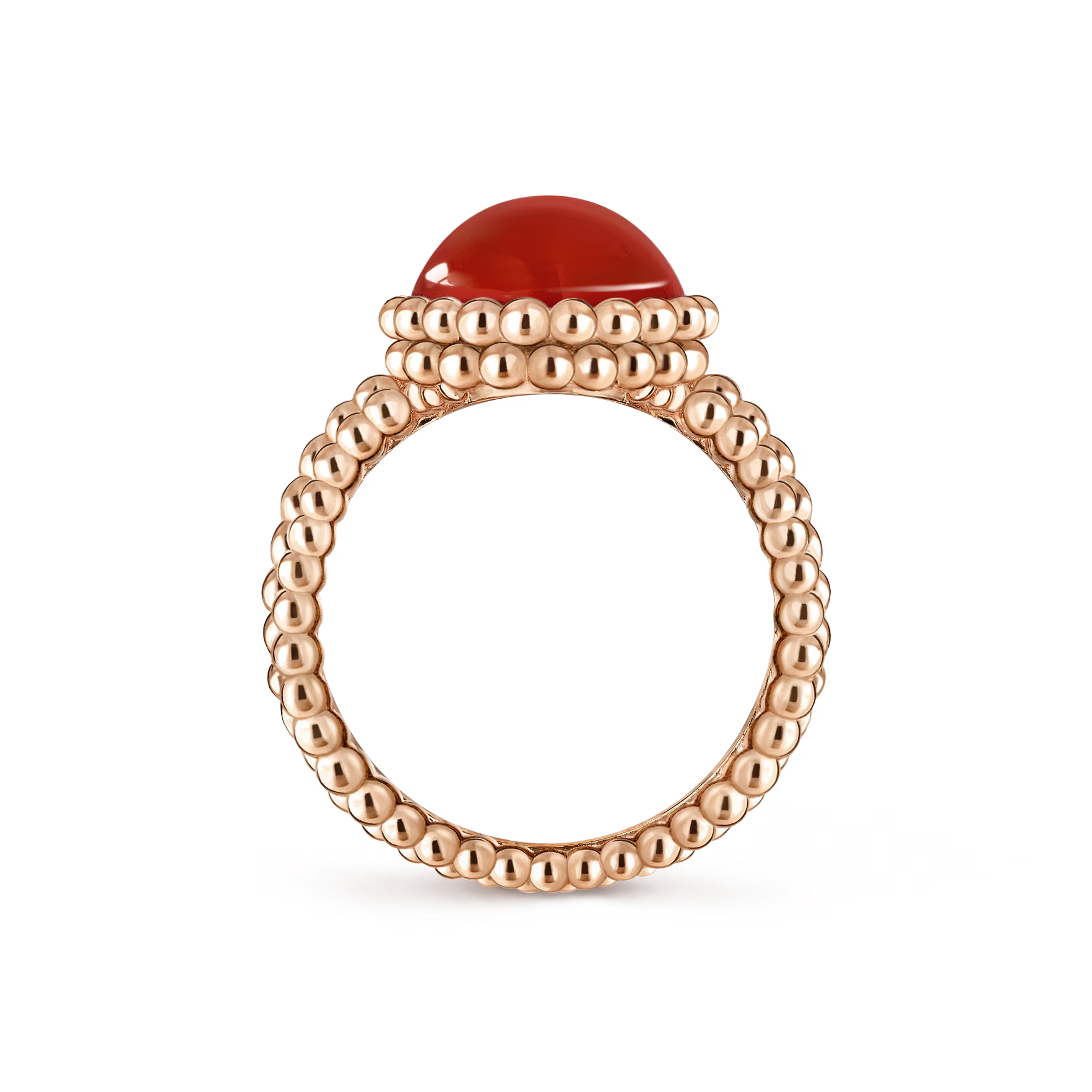 The 18K rose gold with carnelian version offers a warm, passionate glow. Carnelian’s vibrant red-orange hue radiates energy and optimism, beautifully contrasted by the soft, feminine blush of rose gold. The surrounding golden pearls add dimension and light, framing the stone with exceptional craftsmanship.