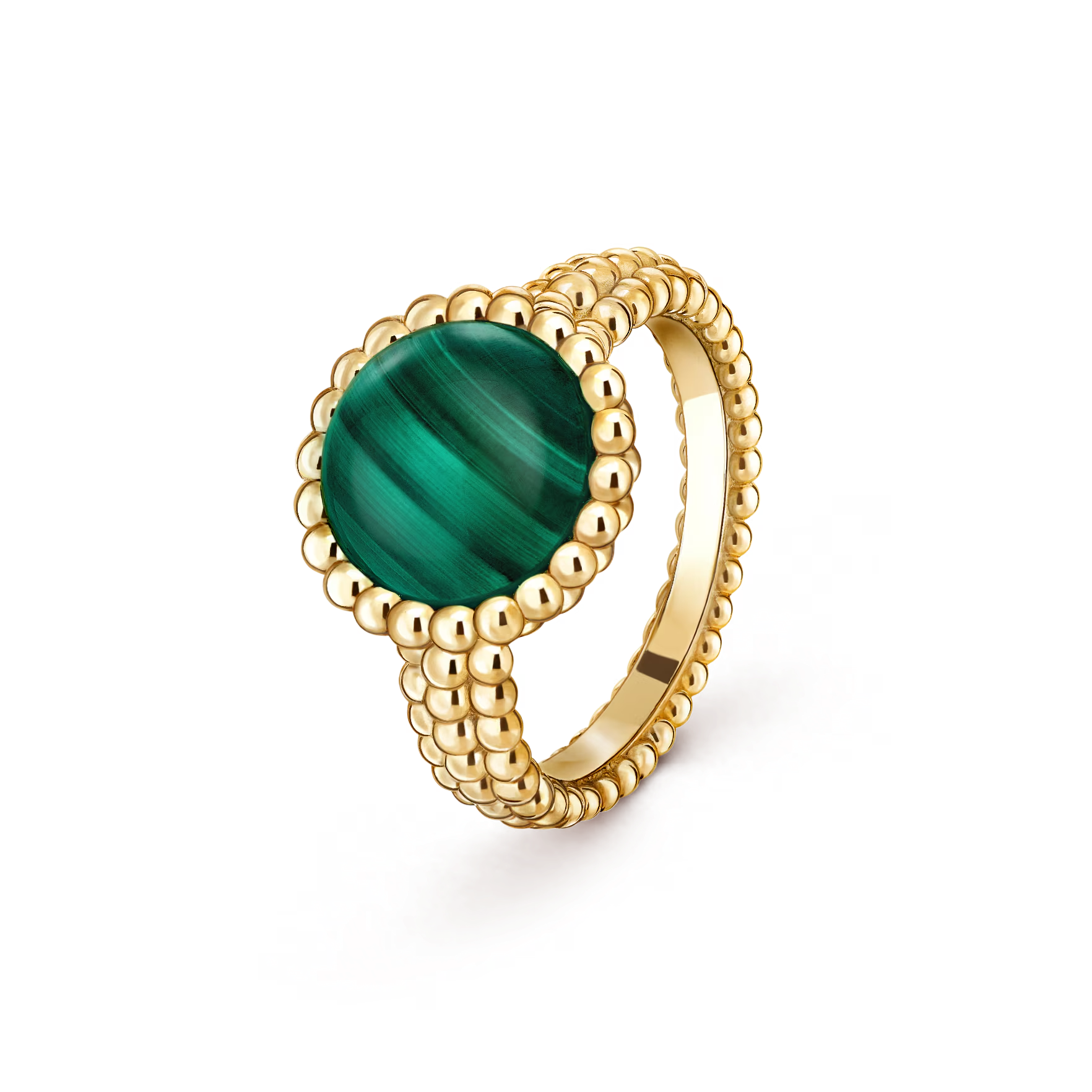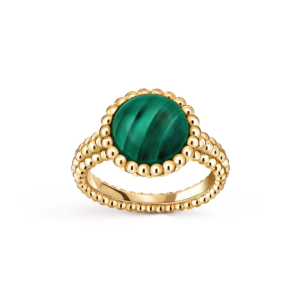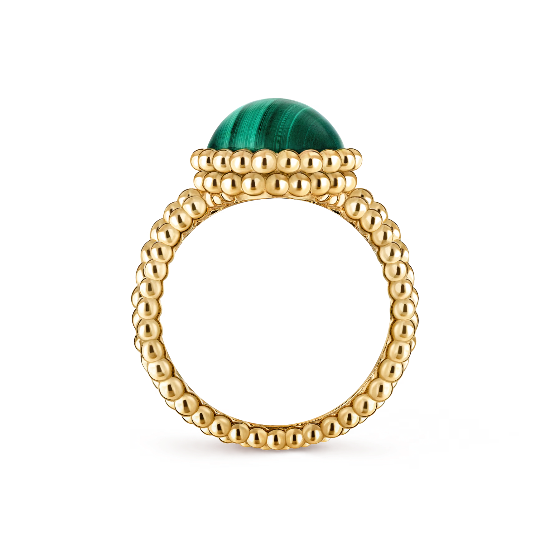 The 18K yellow gold with malachite model showcases the deep, rhythmic beauty of malachite’s natural striations. Its lush green tones are complemented by a halo of polished golden beads, enhancing the stone’s serene and powerful presence.