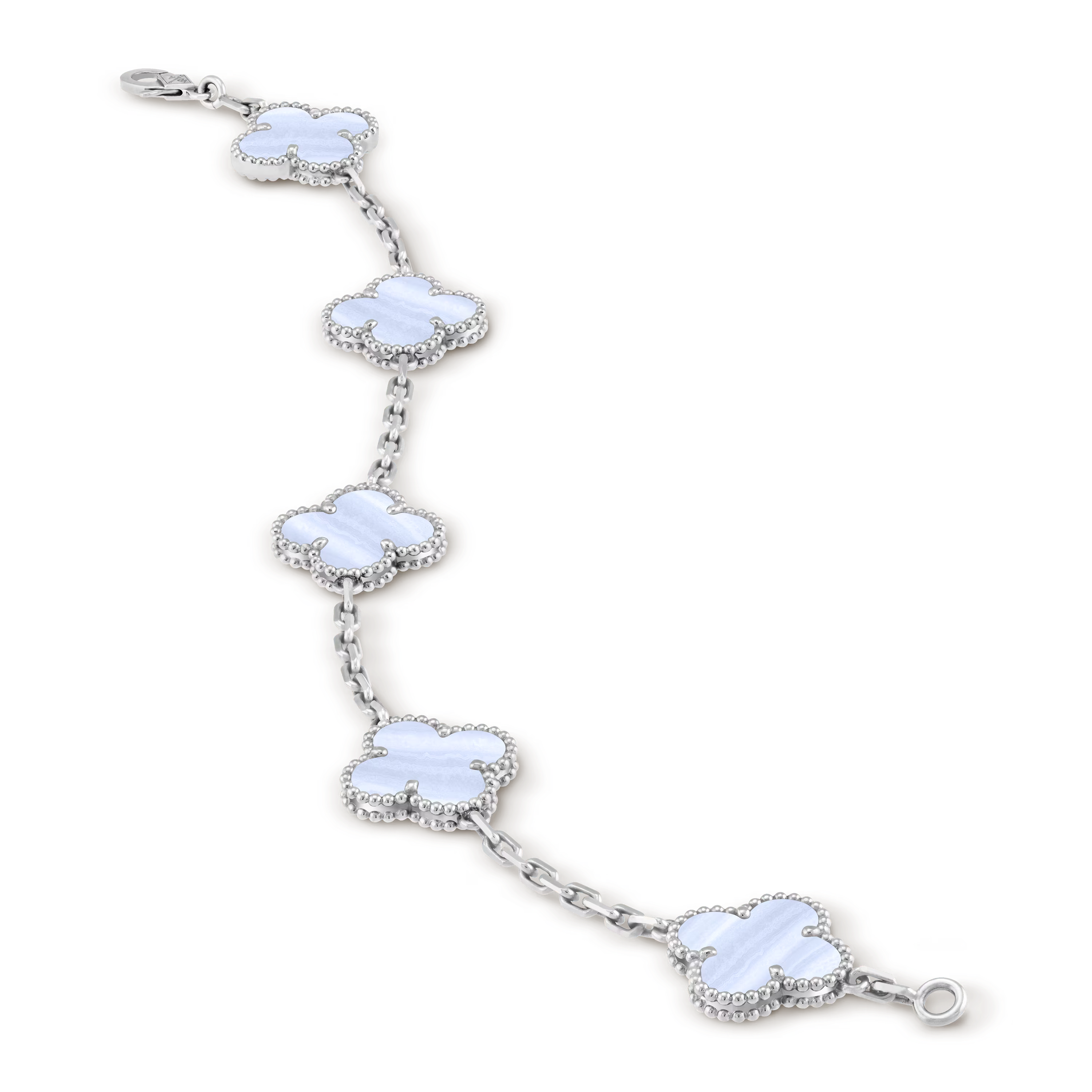 This bracelet features five Vintage Alhambra motifs, each defined by the collection’s signature beaded edge. Evenly spaced along the wrist, the motifs create a balanced and harmonious composition that reflects classic symmetry and refined restraint.