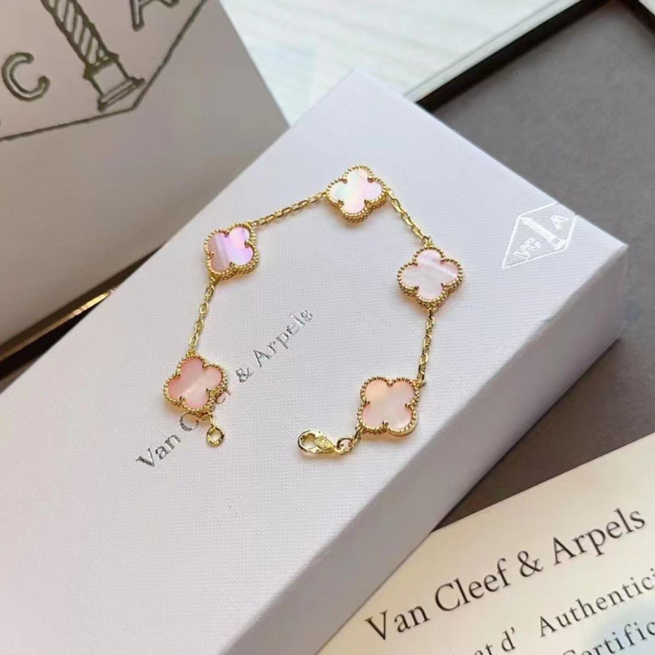 This bracelet features five Vintage Alhambra motifs, evenly spaced along the chain. The symmetrical composition creates a balanced and elegant rhythm on the wrist, highlighting the purity of the original design.