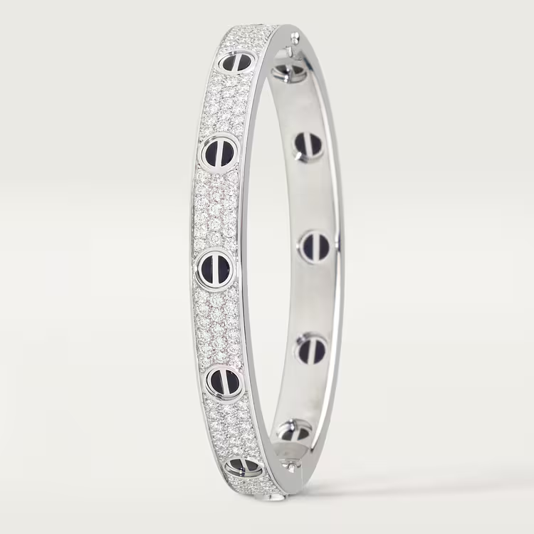 The Cartier LOVE bracelet, classic model, is an iconic expression of enduring love and commitment. Featuring the signature screw motif, the design symbolizes a bond meant to be sealed forever. The pavé setting adds refined brilliance, while the ceramic elements introduce a modern, elegant contrast, embodying Cartier’s timeless design philosophy.