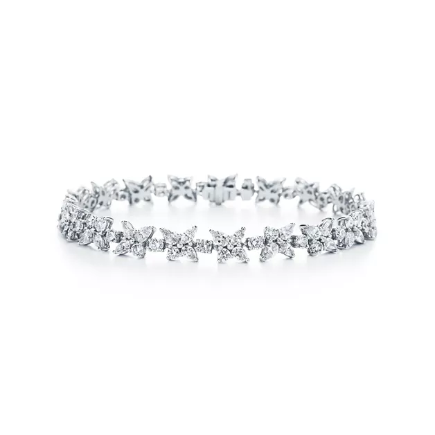 The Tiffany Victoria® Cluster Tennis Bracelet showcases an elegant composition of mixed-cut diamonds arranged in graceful floral clusters. Inspired by the beauty of natural light and organic shapes, this bracelet offers a refined blend of brilliance, femininity, and timeless sophistication.