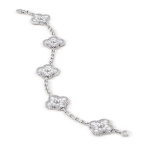 This bracelet features five Vintage Alhambra motifs, delicately aligned along the chain. The symmetrical arrangement creates a refined rhythm on the wrist, embodying balance and classic proportions.