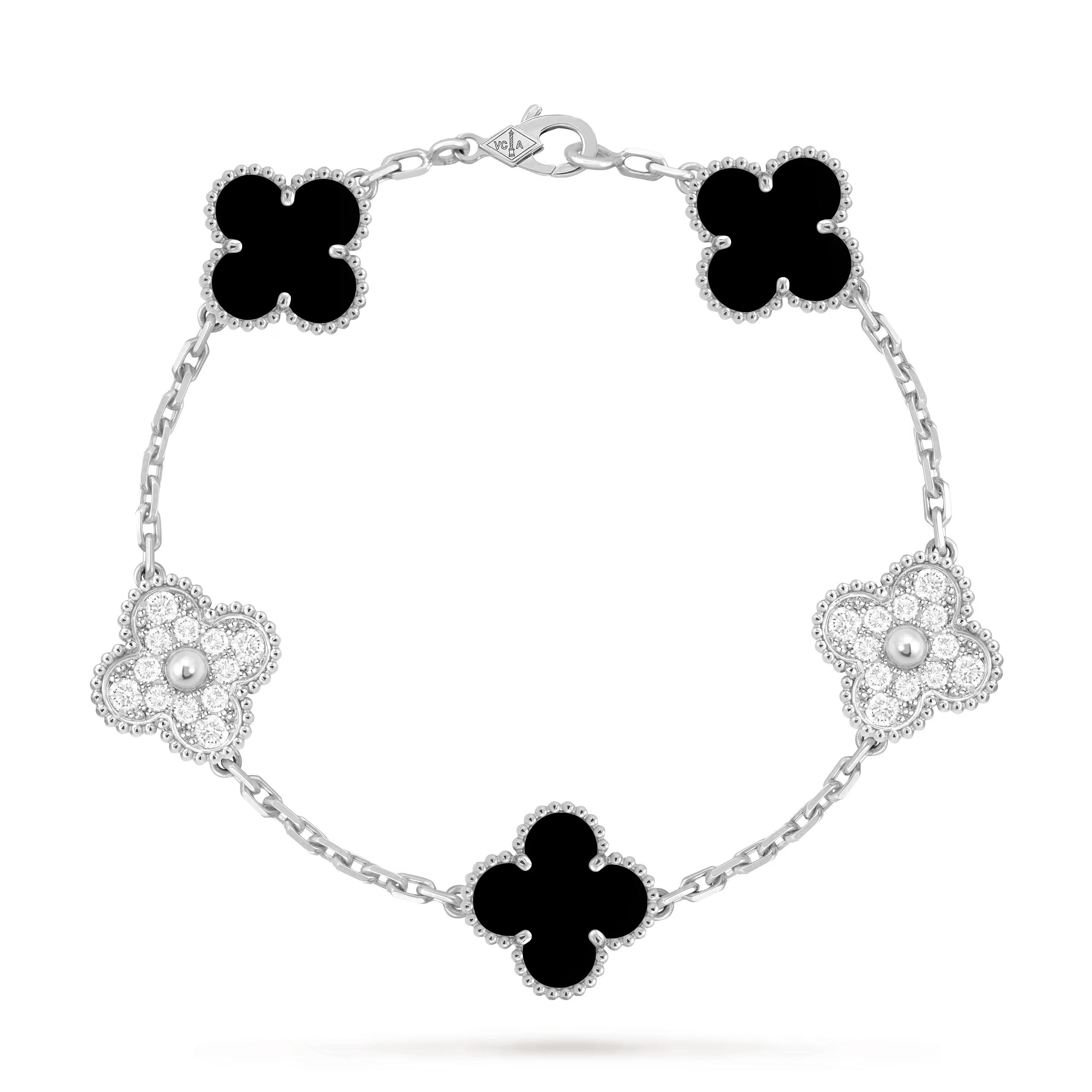 This bracelet showcases five Vintage Alhambra motifs arranged with perfect symmetry along the chain. The balanced spacing creates a refined rhythm on the wrist, highlighting classic proportions and enduring sophistication.