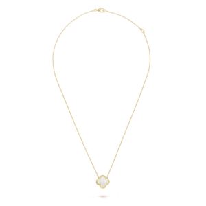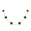 The Vintage Alhambra necklace features ten iconic four-leaf clover motifs, each crafted from natural materials and framed with delicate 18K gold beaded edges. This design symbolizes luck, harmony, and timeless elegance.