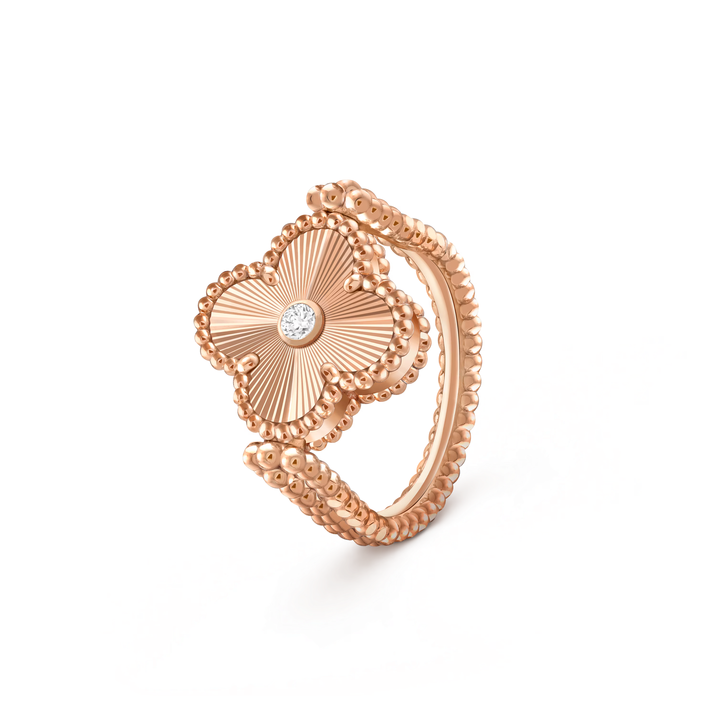 A captivating expression of versatility and grace, the Vintage Alhambra Reversible Ring reimagines the Maison’s iconic emblem of luck through an innovative, two-sided design. Crafted in glowing 18K rose gold, this ring lets you choose between two distinct moods—each infused with the timeless poetry of the Alhambra Collection.